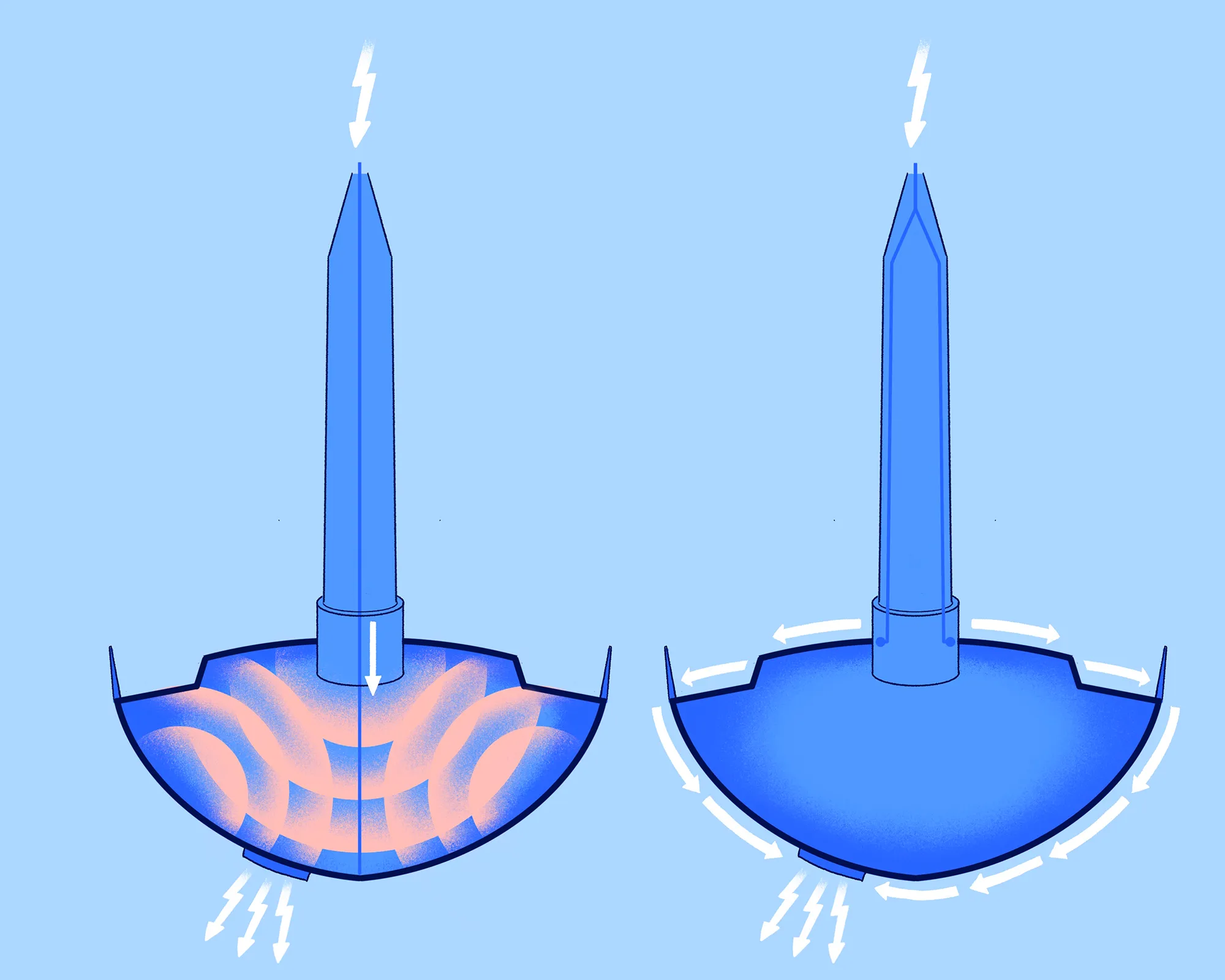 The key element in channeling the lightning strike to the outside of the hull was the mast. Rather than the cable carrying the current going straight through the middle, it needed to exit the mast just above the decking.